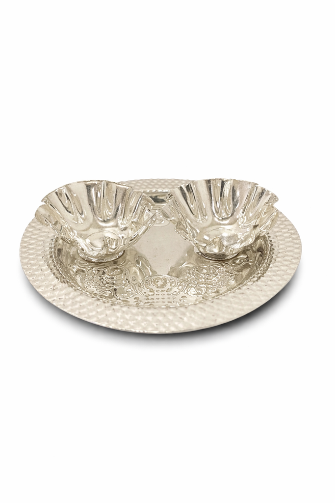 Enhance your pooja rituals with this elegant German Silver Dual Kumkum Holder, thoughtfully designed with two flower-shaped bowls set on a beautifully engraved circular tray. The intricate textures and embossed detailing reflect fine craftsmanship, while the high-polish German silver finish lends a rich, traditional appeal.