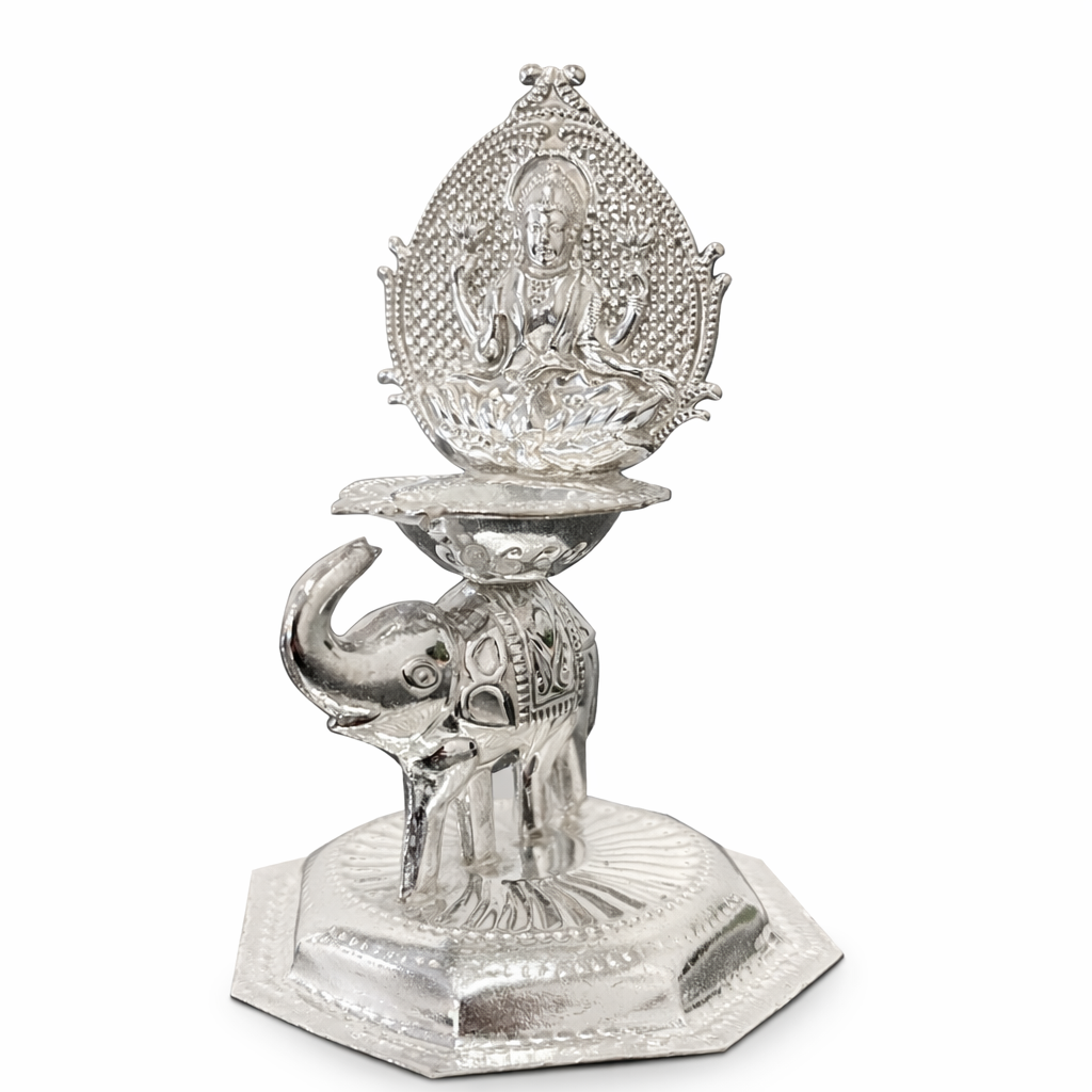 Made from premium German silver, the diya showcases intricate engravings, a radiant silver finish, and a sturdy, well-balanced base. The elephant pedestal adds a regal touch, while the lotus-shaped diya represents purity and positivity, making it an ideal addition to your pooja room or festive décor.