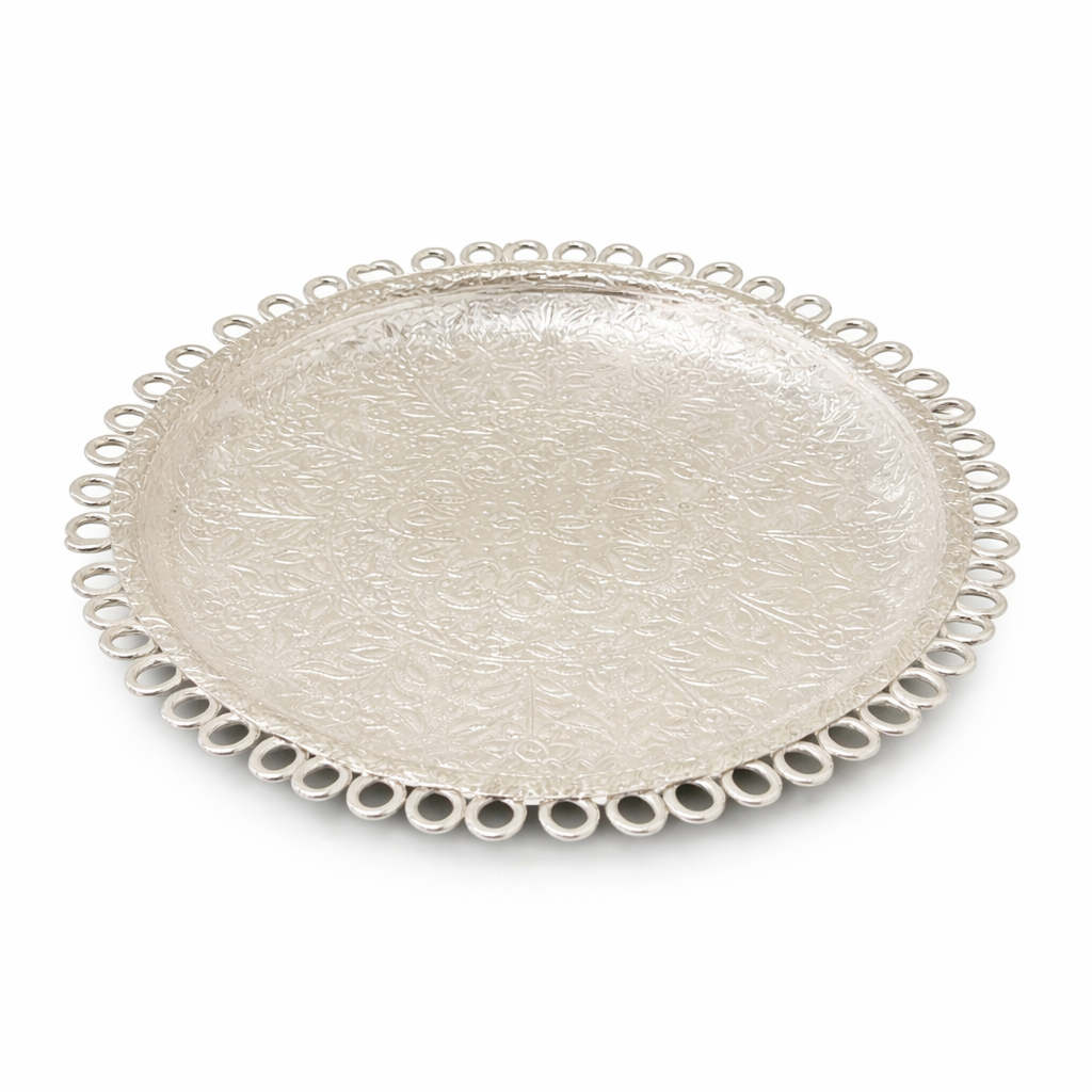 Made from high-quality German silver, the thali offers a radiant silver finish that is both durable and easy to maintain. The decorative looped border elevates its design, making it as visually striking as it is functional.