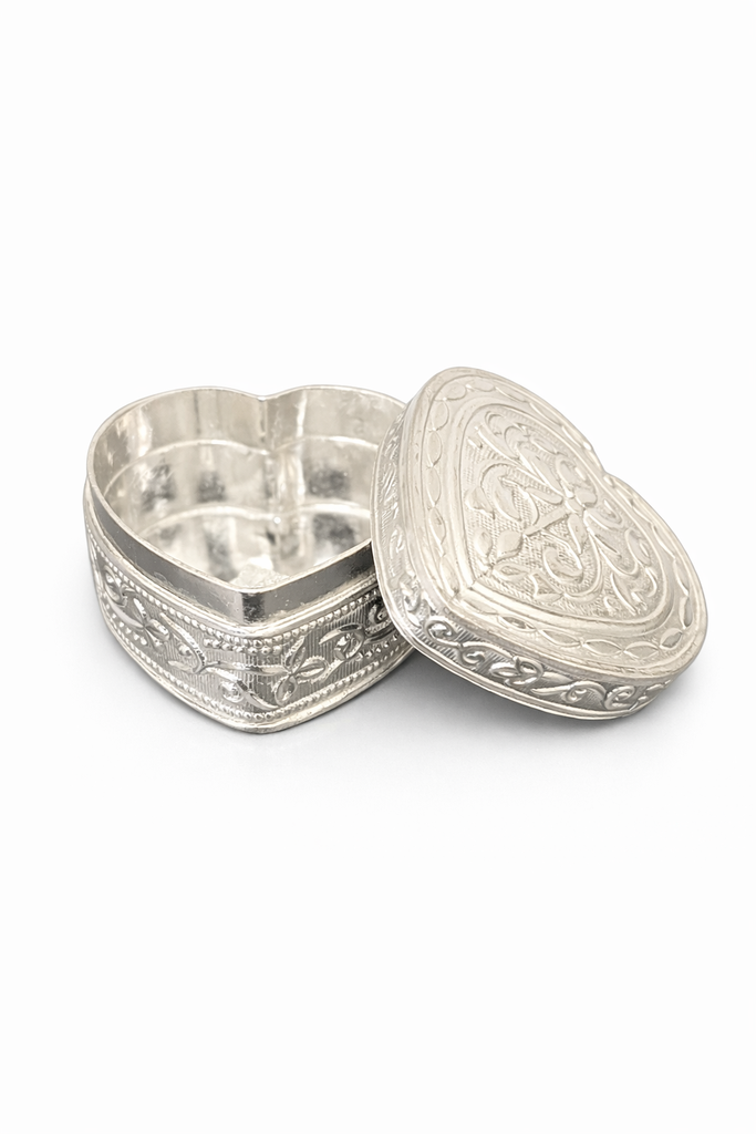 Add a touch of timeless elegance to your puja essentials with this beautifully crafted heart-shaped Sindoor Dabbi made from premium German silver. Designed with delicate engraved floral patterns, this dabbi reflects traditional charm while maintaining a refined, polished finish.