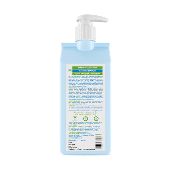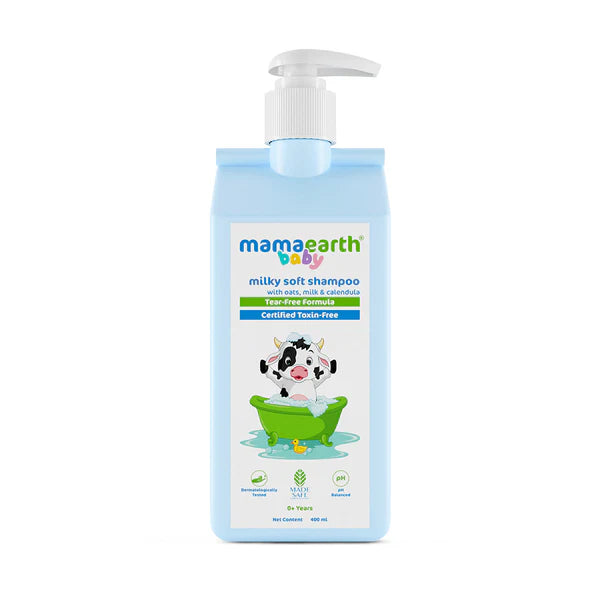 Hi! I am Mamaearth Milky Soft Shampoo for Babies. This product is a shampoo formulated for babies. It contains ingredients such as oats, calendula, and milk protein. The formulation does not include silicones, parabens, mineral oil, or dyes. It holds MadeSafe Certification. Please refer to the product packaging for detailed information and usage instructions.