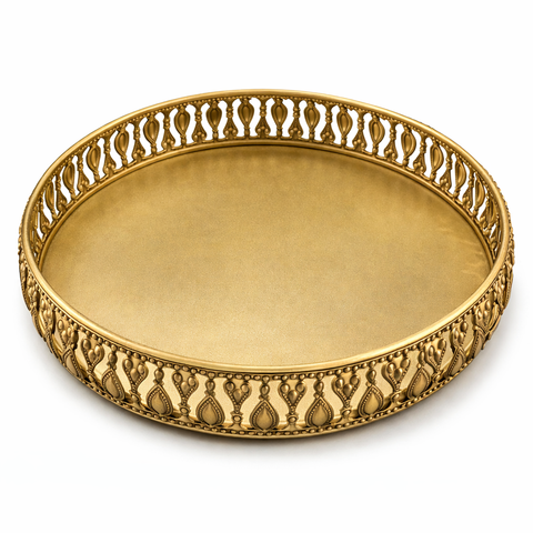 The ornamental rim showcases delicate repeating motifs that add depth and texture, while the warm antique gold finish gives it a luxurious yet understated appeal. Whether styled as a festive centerpiece, used in puja arrangements, or displayed on a console or coffee table, this thali makes an effortlessly sophisticated statement.