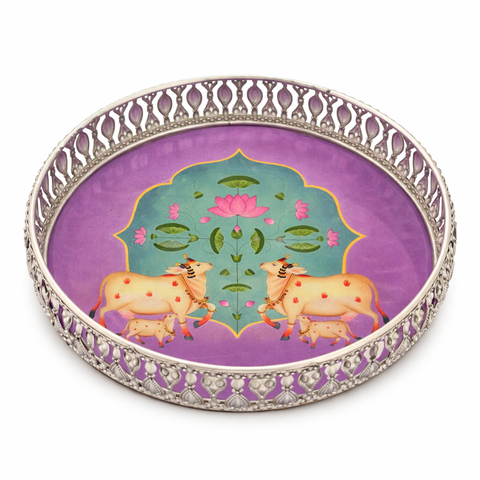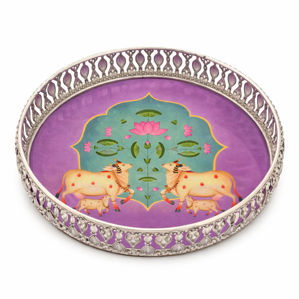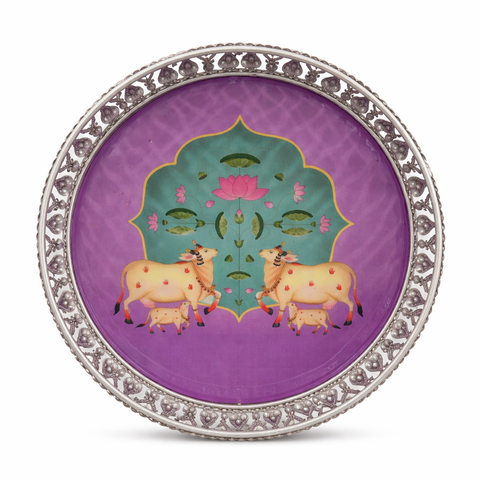 Bring divine elegance and traditional charm into your home with this beautifully crafted decorative thali featuring sacred cow artwork and a blooming lotus motif. Designed in rich purple and teal tones, the centerpiece artwork reflects timeless Indian heritage and spiritual symbolism.