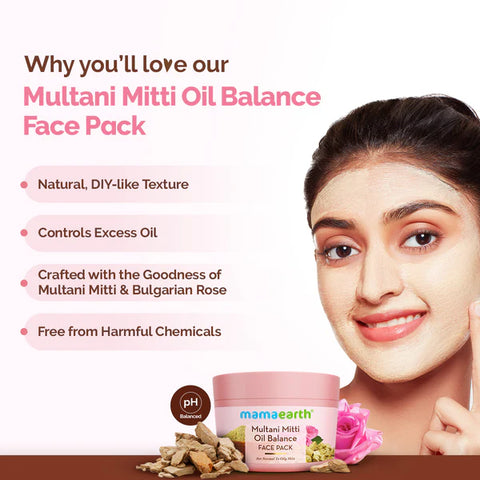 DIY face masks seem like a good idea until the mess and potential skin irritation ruin the fun. Put an end to the hassle with our all new skin-friendly, pH balanced Mamaearth Multani Mitti Oil Balance Face Pack featuring a DIY-like texture! Combining the wisdom of ancient skincare with modern convenience, this purifying face pack controls excess oil, refines pores, and keeps breakouts at bay without drying out your skin. Just smooth it on, sit back & let these skin-loving ingredients do the work: Multani Mitti – Absorbs excess oil & minimizes pores. Bulgarian Rose – A natural humectant that hydrates & soothes skin. Glycerin – Nourishes, locks in moisture & keeps skin supple. Panthenol – Boosts hydration & repairs the skin barrier. With a smooth clay-cream texture, this face pack spreads effortlessly and gives an instant cooling effect, calming irritated and acne-prone skin while drawing out impurities. Hello, clear, balanced & radiant skin! Safe for normal to oily and acne-prone skin, this dermatologically tested & Made Safe Certified formula is free from harmful chemicals, SLS/SLES, Paraben, LLP, Mineral Oil and Silicones because your skin deserves the best care possible. No mixing, no mess—just oil-controlled, purified, hydrated and refreshed skin in 15 minutes flat!
